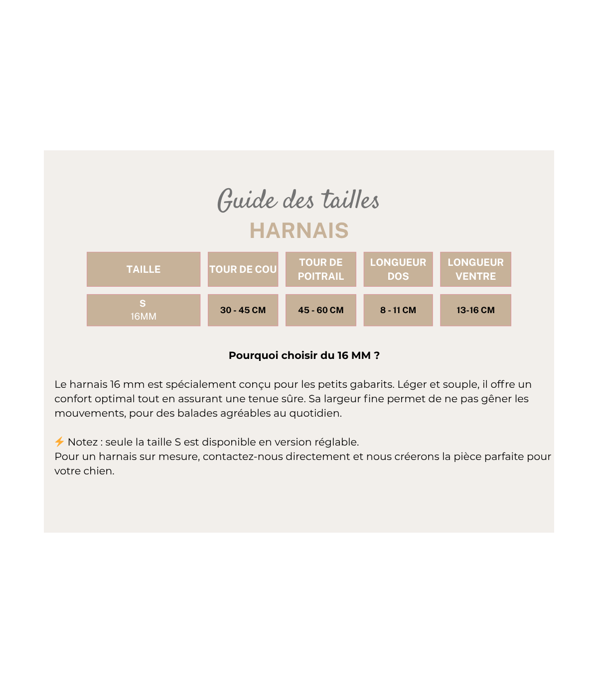 Nos harnais 16 mm pour petits chiens sont légers, confortables et élégants, conçus pour offrir un maintien sûr tout en restant agréables à porter au quotidien.